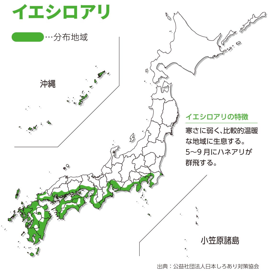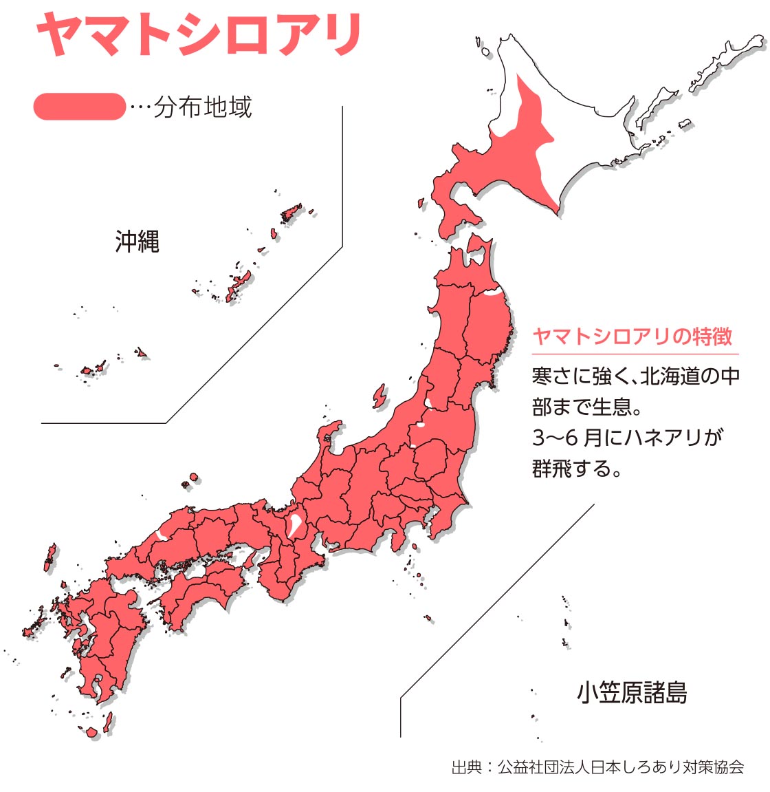 シロアリは北海道の北部を除く日本全国に生息しています。