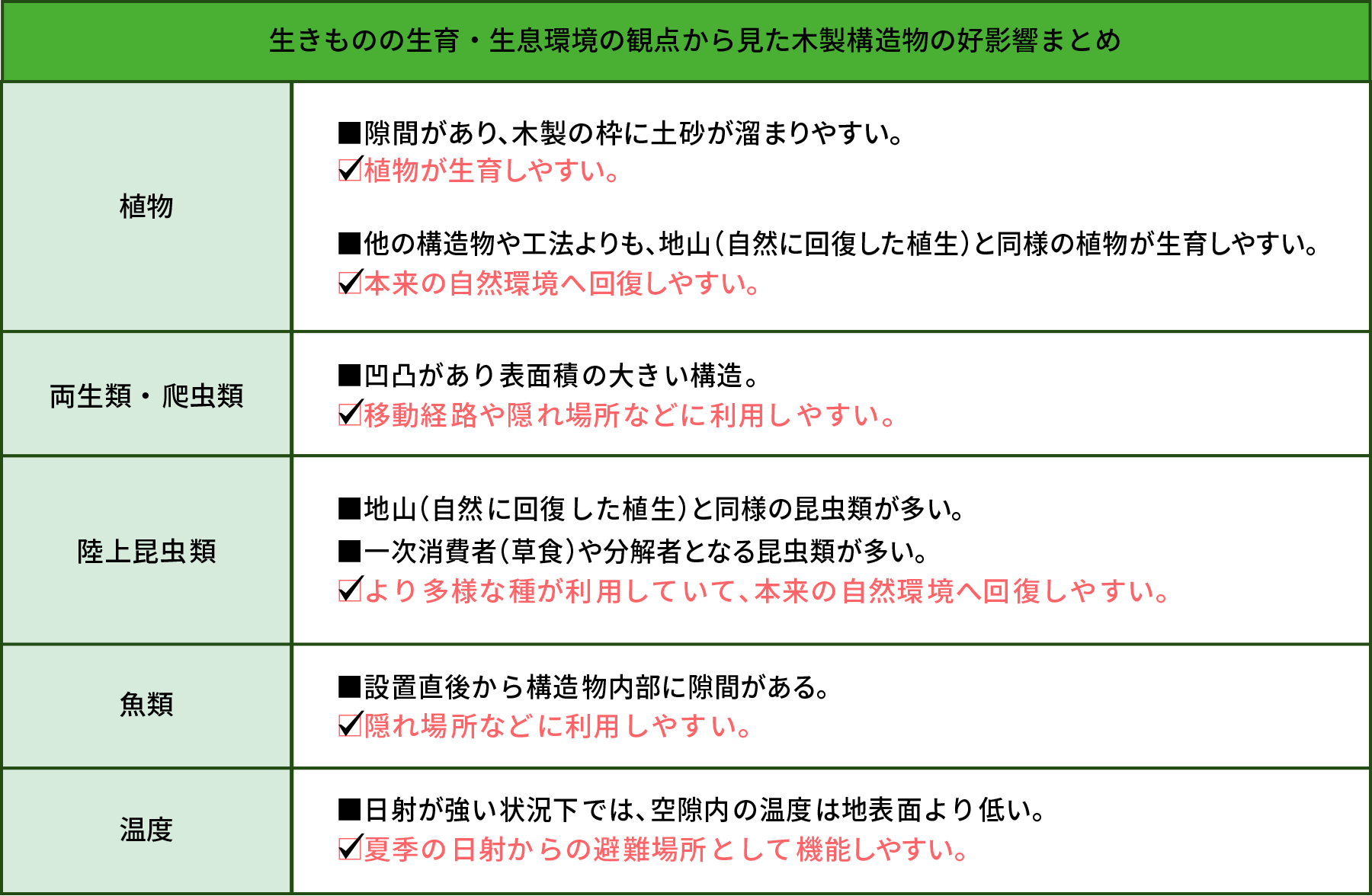 木製構造物が、生き物にとって日射と熱からの避難